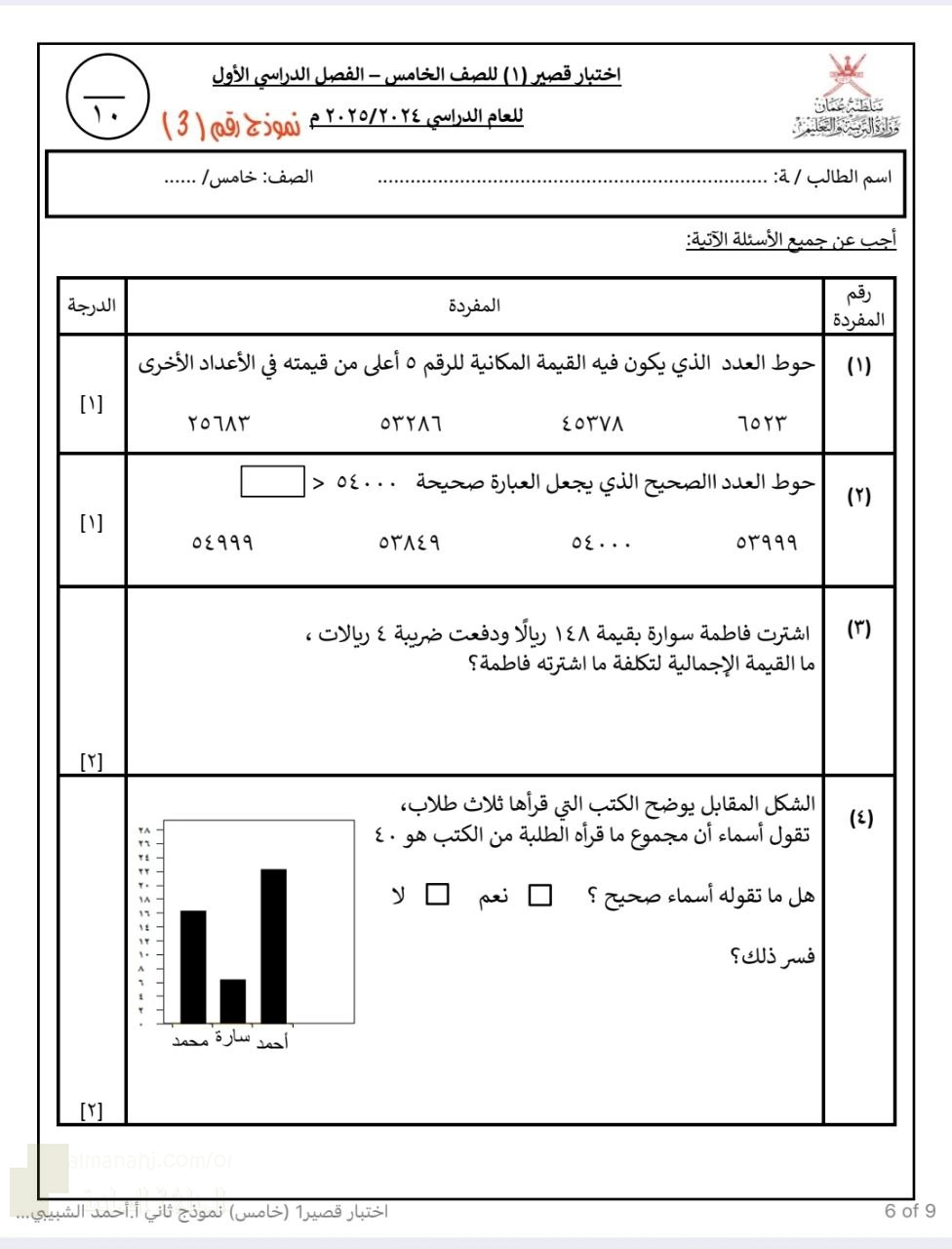 | أنت هنا: موقع فايلاتي ⇦ موقع فايلاتي - عُمان ⇦ الصف الخامس ⇦ رياضيات ⇦ الفصل الأول ⇦ اختبارات |