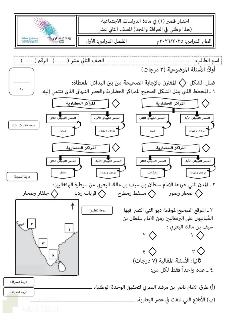 | اختبار قصير أول نموذج ثامن مصحوب بالإجابات 2025-2026م - إعداد: محمد بن إسماعيل عبدالله البلوشي | ||