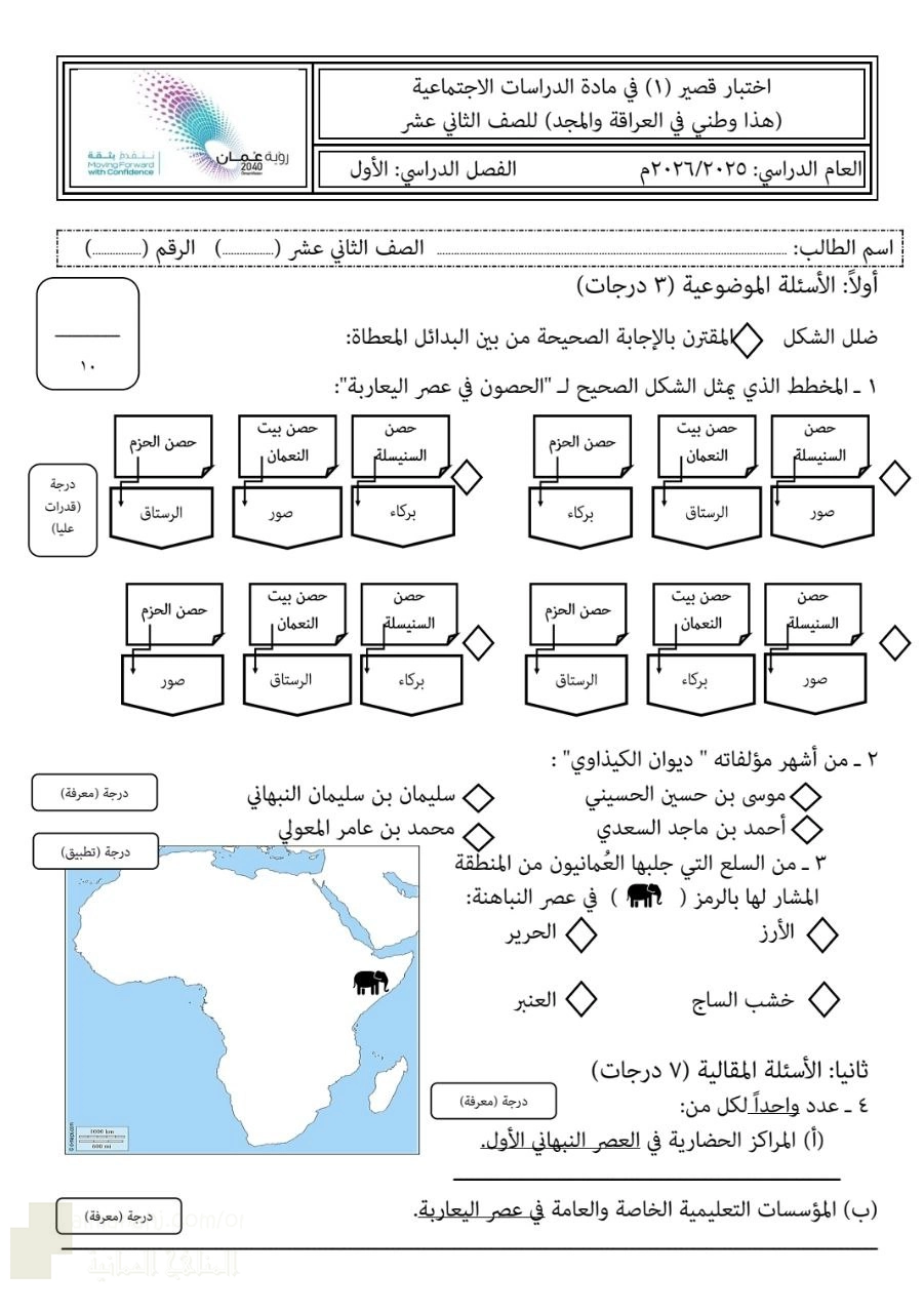 | اختبار قصير أول نموذج (١٢) مصحوب بالإجابات 2025-2026م - إعداد: محمد بن إسماعيل عبدالله البلوشي | ||