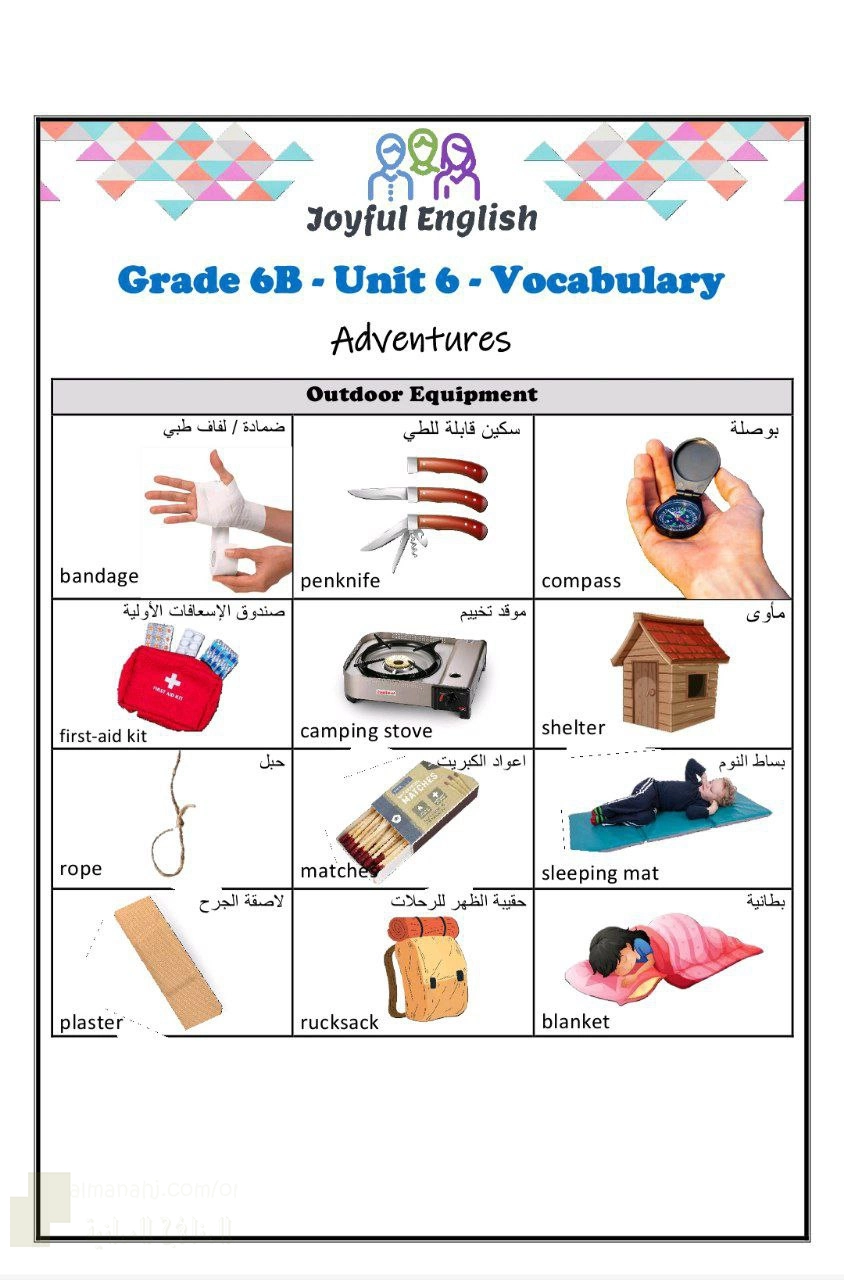 10. لغة انجليزية, مفردات الوحدة السادسة أدوات المغامرات والإصابات والأمراض