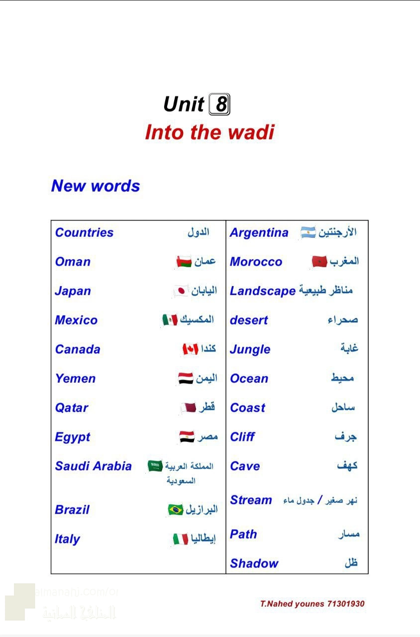الوصف: تستعرض هذه الوحدة مفردات متنوعة تشمل أسماء الدول والمناظر الطبيعية (مثل الصحراء والغابة والساحل) والمواد الغذائية (كالبروتين والفيتامينات) والمواد الخام (كالقطن والجلد). | ||