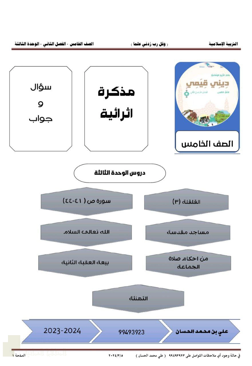 1. تربية اسلامية, مذكرة إثرائية الوحدة الثالثة القلقة
