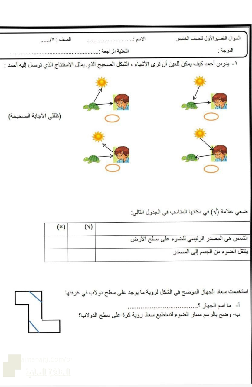 3. علوم, اختبارات قصيرة في الضوء والمرايا قانون الانعكاس وتطبيقاته العملية