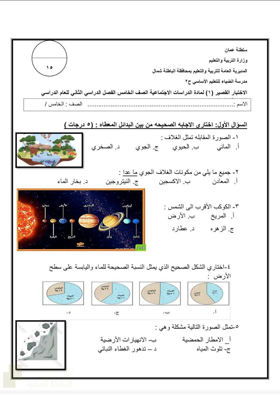 1. اجتماعيات, اختبار قصير الأول أغلفة الأرض والمجموعة الشمسية والمشكلات البيئية