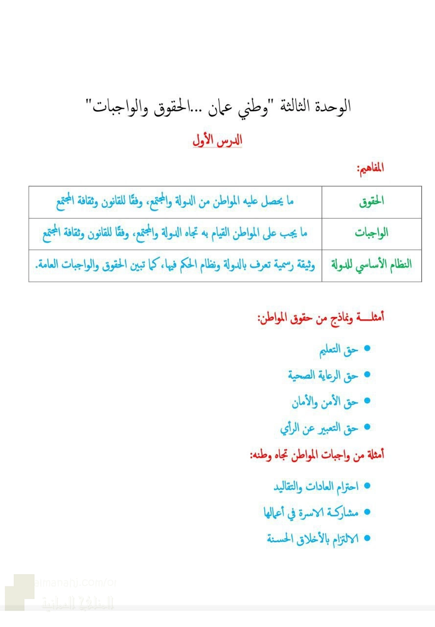 5. اجتماعيات, ورقة عمل الوحدة الثالثة وطني عمان الحقوق والواجبات