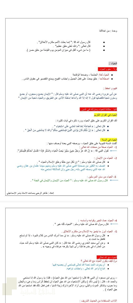7. تربية اسلامية, القيم الأخلاقية الحياء القناعة الإحسان والإصلاح بين الناس