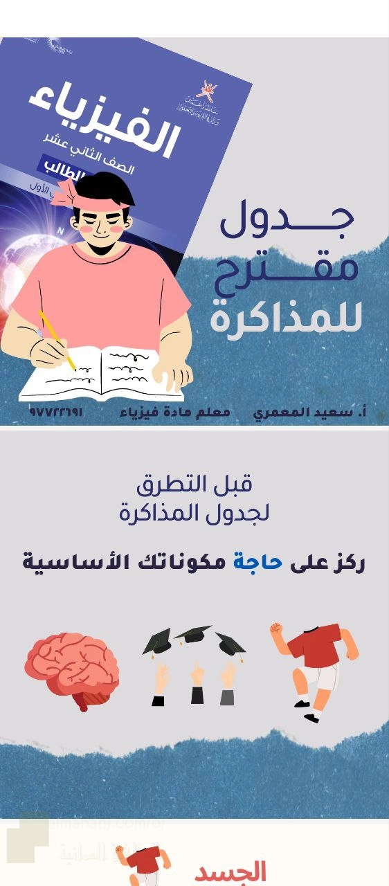 | جدول مقترح للمذاكرة مع تأكيد على الاهتمام بالجسد والروح والعقل - إعداد: سعيد المعمري | ||