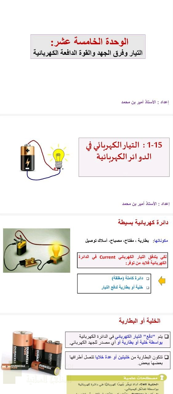9. فيزياء, الوحدة الخامسة عشر التيار وفرق الجهد والقوة الدافعة الكهربائية