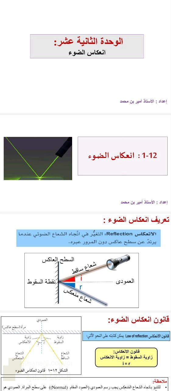 الوحدة الثانية عشر انعكاس الضوء - موقع فايلاتي - عُمان