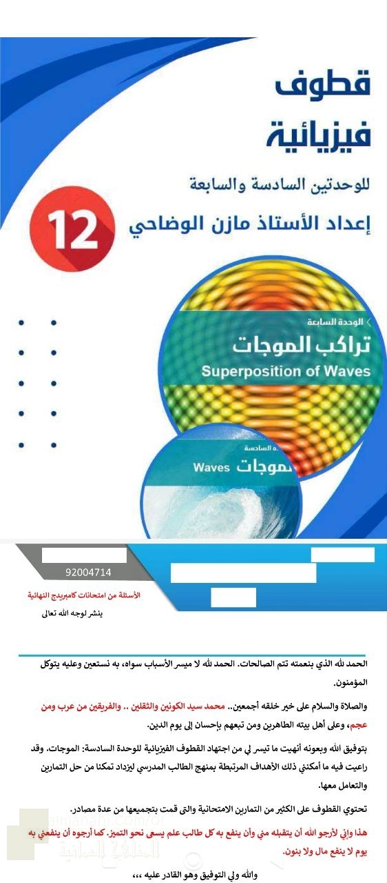 1. فيزياء, ملخص شامل لمذكرة قطوف فيزيائية للوحدتين السادسة والسابعة الموجات وتراكبها
