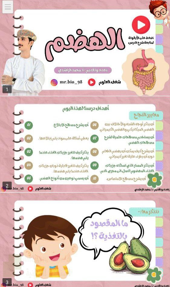 الوصف: يشرح درس الأحياء للصف التاسع عملية الهضم من خلال مقارنة نوعي الهضم الرئيسيين: الميكانيكي الذي يُفكك الطعام فيزيائياً دون تغيير تركيبه الكيميائي (كالطحن بالمضغ)، والكيميائي الذي يحوّل الطعام إلى جزيئات أبسط بفعل الإنزيمات (كتحليل النشا). | ||