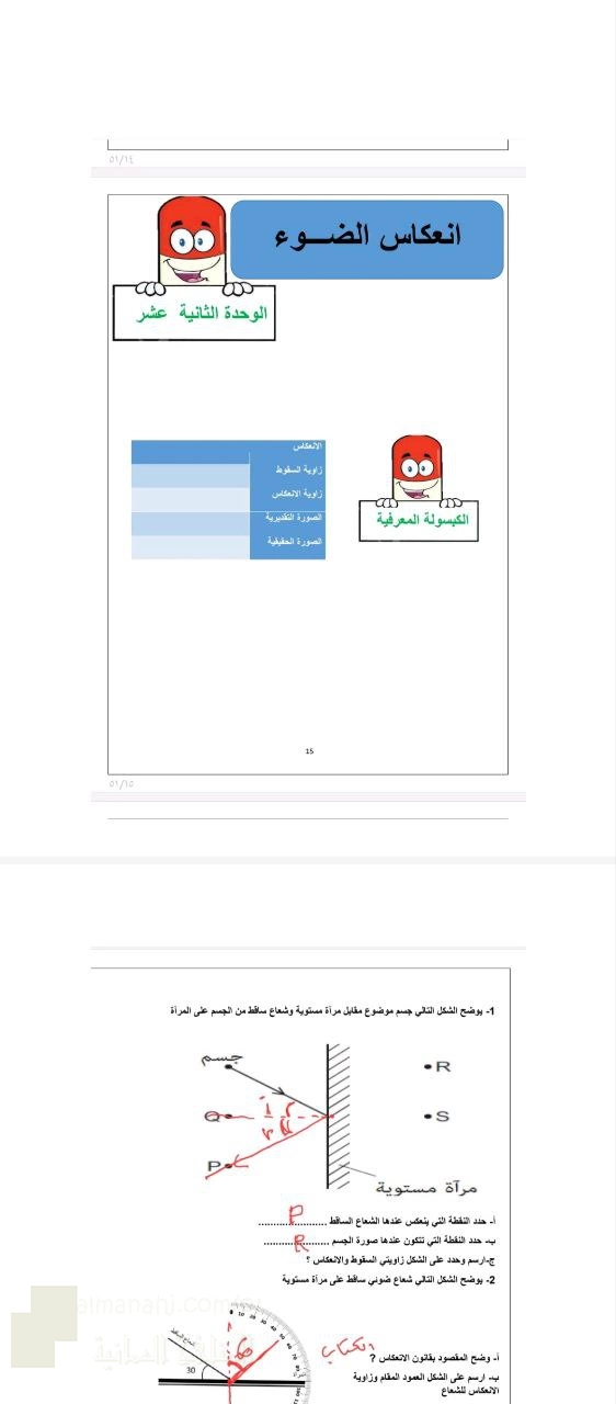 اضغط هنا لتحميل الملف: الوحدة الثانية انعكاس الضوء عشر تحليل مفاهيم وقوانين الانعكاس في المرايا المستوية