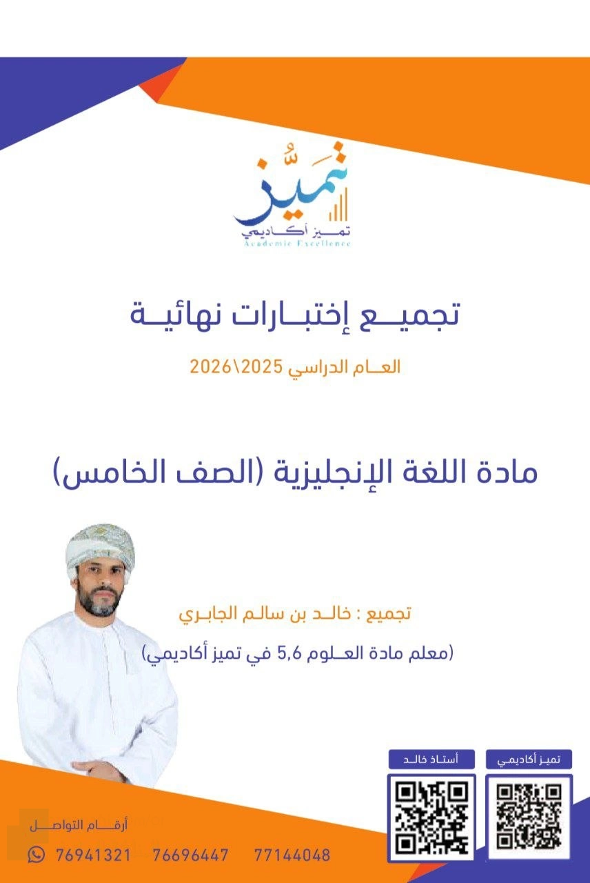الوصف: يقدم هذا الملف تجميعاً شاملاً لنماذج الاختبارات النهائية لمادة اللغة الإنجليزية للصف الخامس للفصل الدراسي الثاني للعام 2025-2026، ويشمل عدة جلسات امتحانية (صباحية ومسائية). | ||