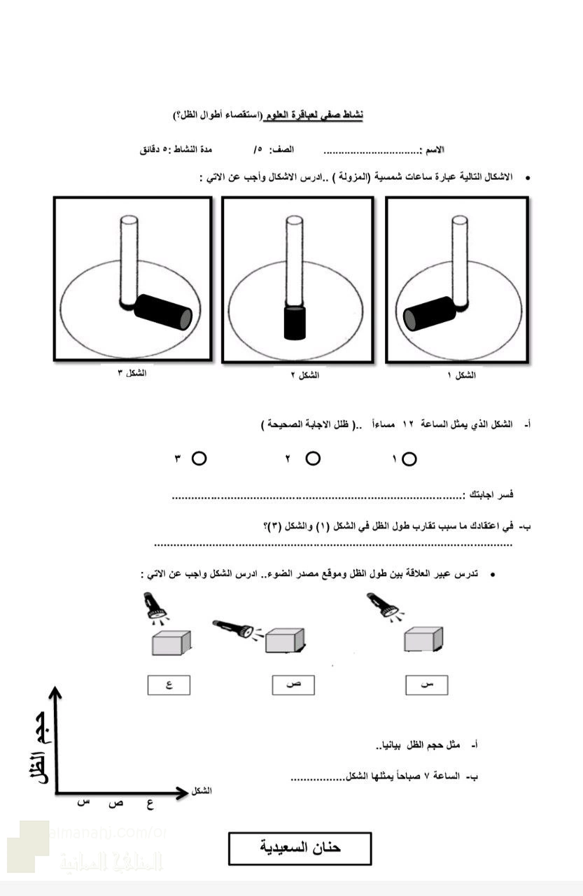 5. علوم, نشاط صفي للعباقرة أوراق عمل ما الذي يؤثر على حجم الظل