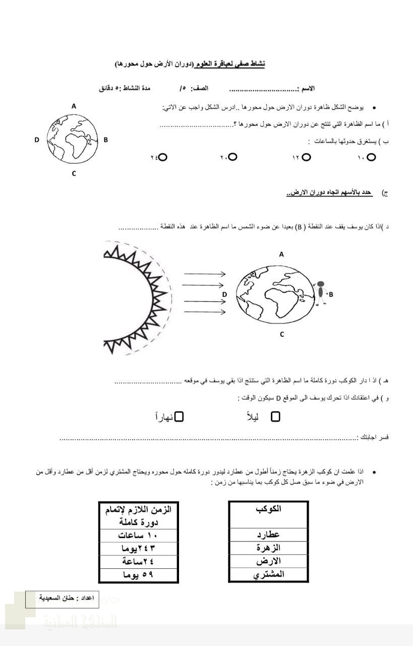 | نشاط صفي للعباقرة أوراق عمل دورا الأرض حول محورها - إعداد: حنان السعيدية | ||