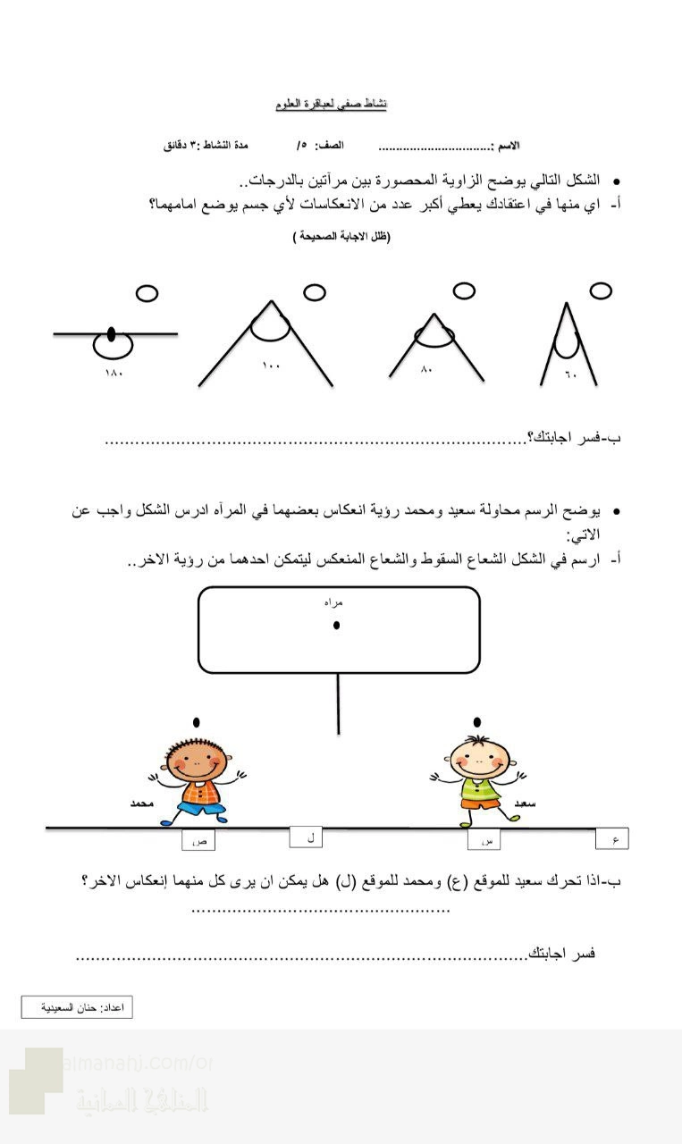 7. علوم, نشاط صفي للعباقرة أوراق عمل تغير إتجاه الضوء